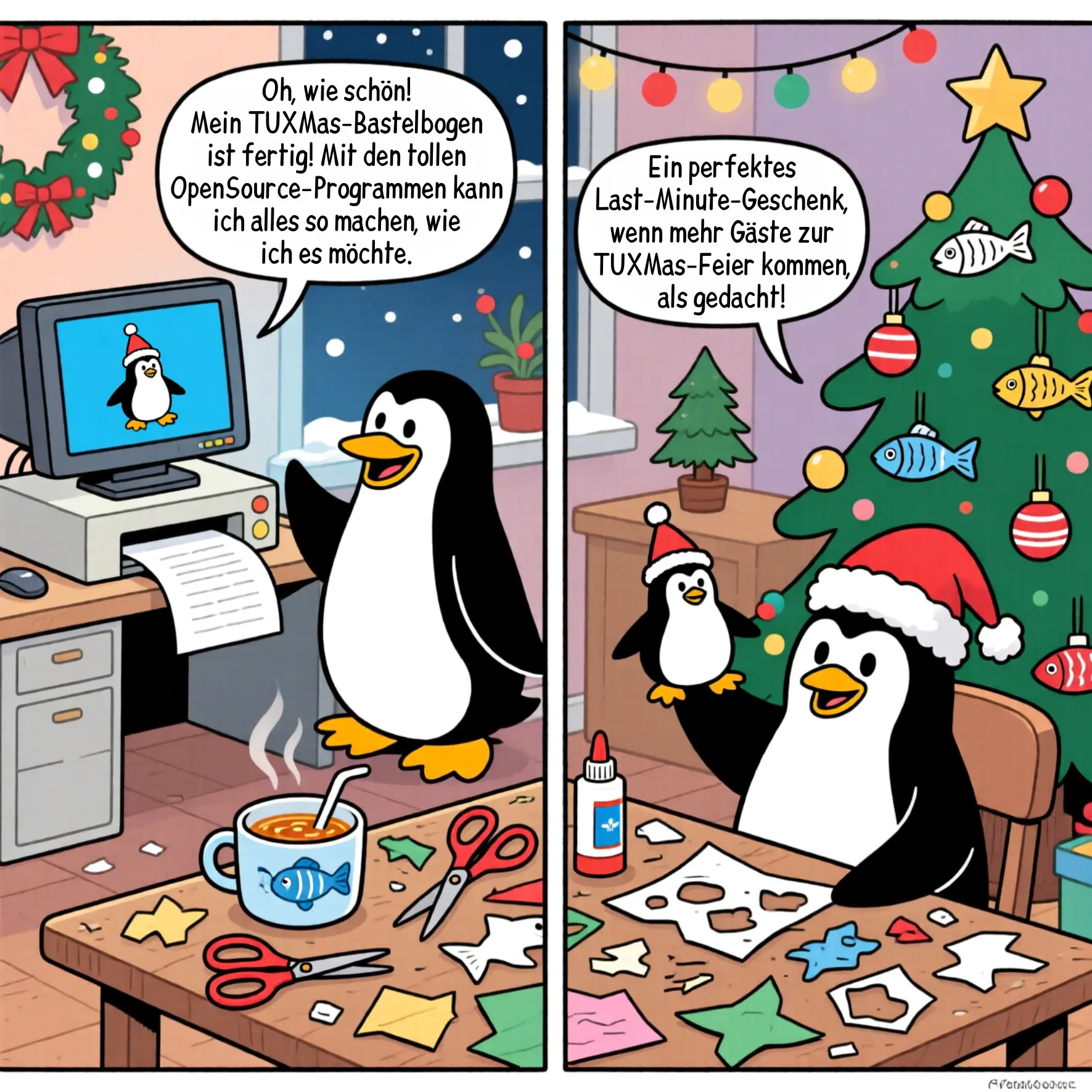 Gestaltet doch einfach mal mit den OpenSource-Programmen, die Ihr im TUXMas-Kalender kennengelernt habt, einen eigenen Bastelbogen und beschenkt damit einen lieben Menschen oder Pinguin :-) |