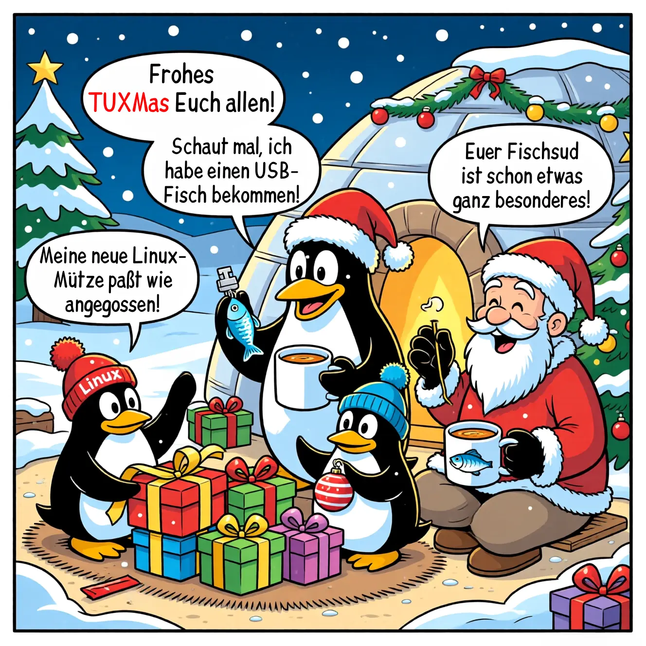 Frohes TUXMas Euch allen! Ich wünsche euch allen frohe TUXMas – oder Weihnachten, wie Ihr Menschen es nennt – viel Freude, Wärme und natürlich ganz viele neue Erkenntnisse. Gönnt Euren Rechnern und Smartphones auch mal etwas Ruhe und genießt gute Gesellschaft und heißen Fischsud (oder Kakao) oder probiert das eine oder andere OpenSource-Programm aus, wenn Ihr die Finger doch nicht von den Geräten lassen könnt. (Alle Türchen sind jetzt offen) Wenn Ihr etwas abschalten möchtet, gibt bei Hoerspielprojekt.de eine Reihe von Hörspielen unter CreativeCommons-Lizenz, die Ihr sooooooft weitergeben dürft wie Ihr wollt. Hört z.B. mal bei Snow rettet Weihnachten, Huckepuck – Der Klabautermann 7, Stefanies Weihnachtsfest oder T.RI.O (1) - Die Fahrraddiebe rein. Happy TUXMas und einen guten Rutsch ins neue Jahr! Euer Tux! |