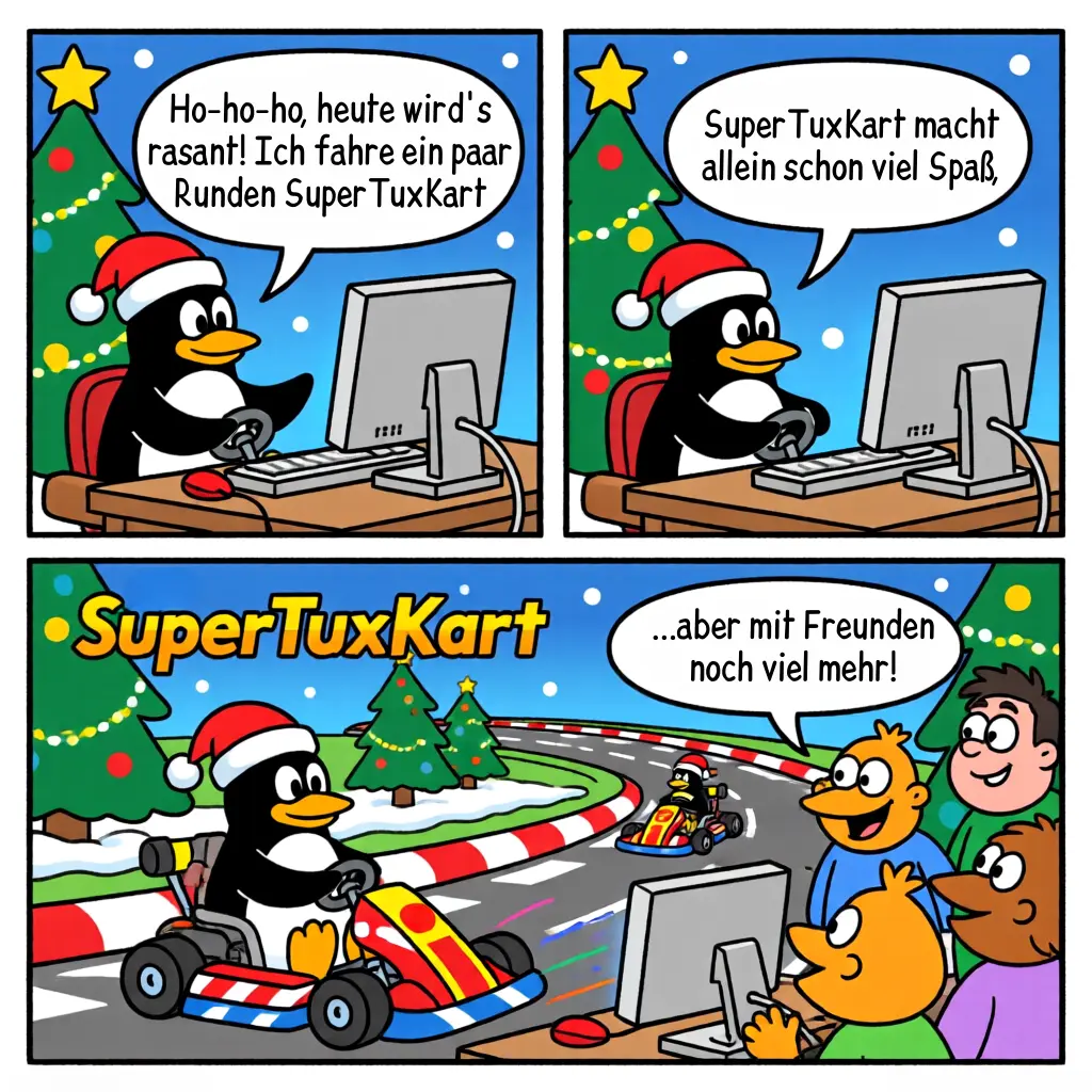SuperTuxKart (supertuxkart.net) ist ein kostenloses OpenSource-3D-Kart-Rennspiel für Linux, Android, Switch Homebrew, Windows und Mac, das total viel Spaß macht – genauso wie Mario Kart, nur mit den Charakteren aus der freien Software-Welt, z.B. dem Pinguin Tux oder dem GNU Gnu. Auf verschiedenen Strecken fahrt Ihr gegen Eure Freunde oder den Computer, sammelt Power-Ups wie Kaugummies, in denen die Mitspieler beim Überfahren klebenbleiben oder Bowlingkugeln, um andere von der Fahrbahn zu kegeln und könnt Spielmodi wie Grand Prix, Zeitfahren oder Multiplayer wählen.